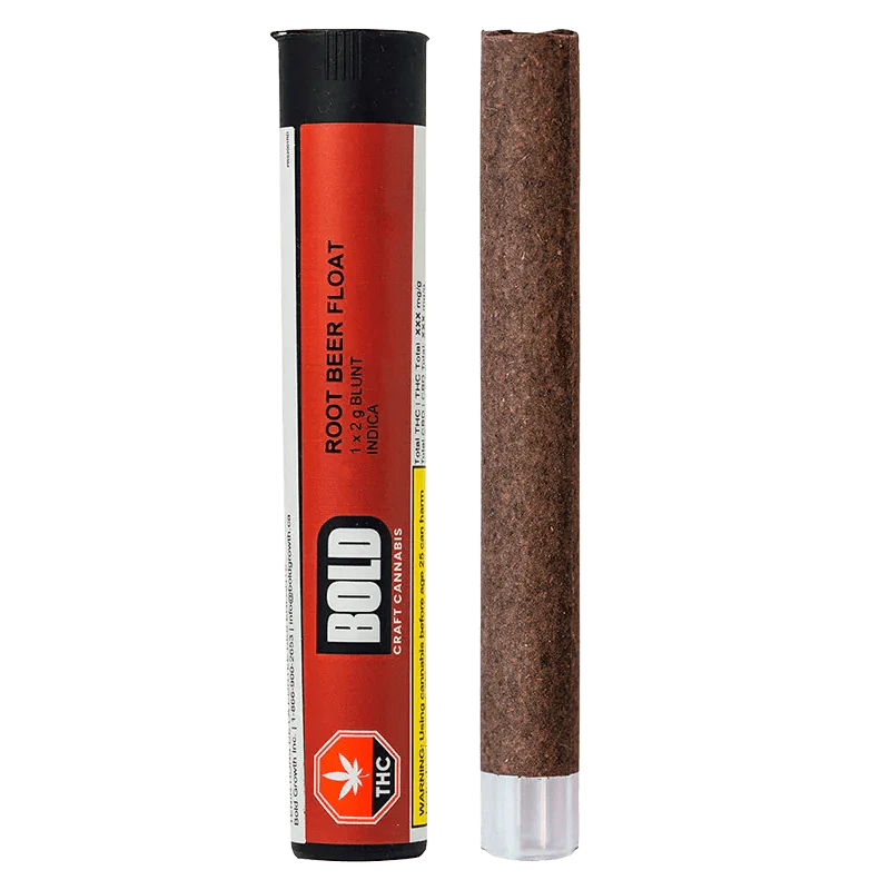 This Root Beer Float blunt is packed with our high potency, indica dominant whole flower. Root Beer Float is a rare cross of XXX OG x Vanilla Kush. Expect a smooth and flavourful burn with sweet, earthy notes, hints of lemon and pine and that signature root beer and frothy vanilla finish. Rolled in a hemp blunt wrap and finished with a glass tip, this extra large hand crafted blunt burns slowly and smoothly. Bold Craft Cannabis is indoor grown, small batch, hang dried, slow cured and hand trimmed.