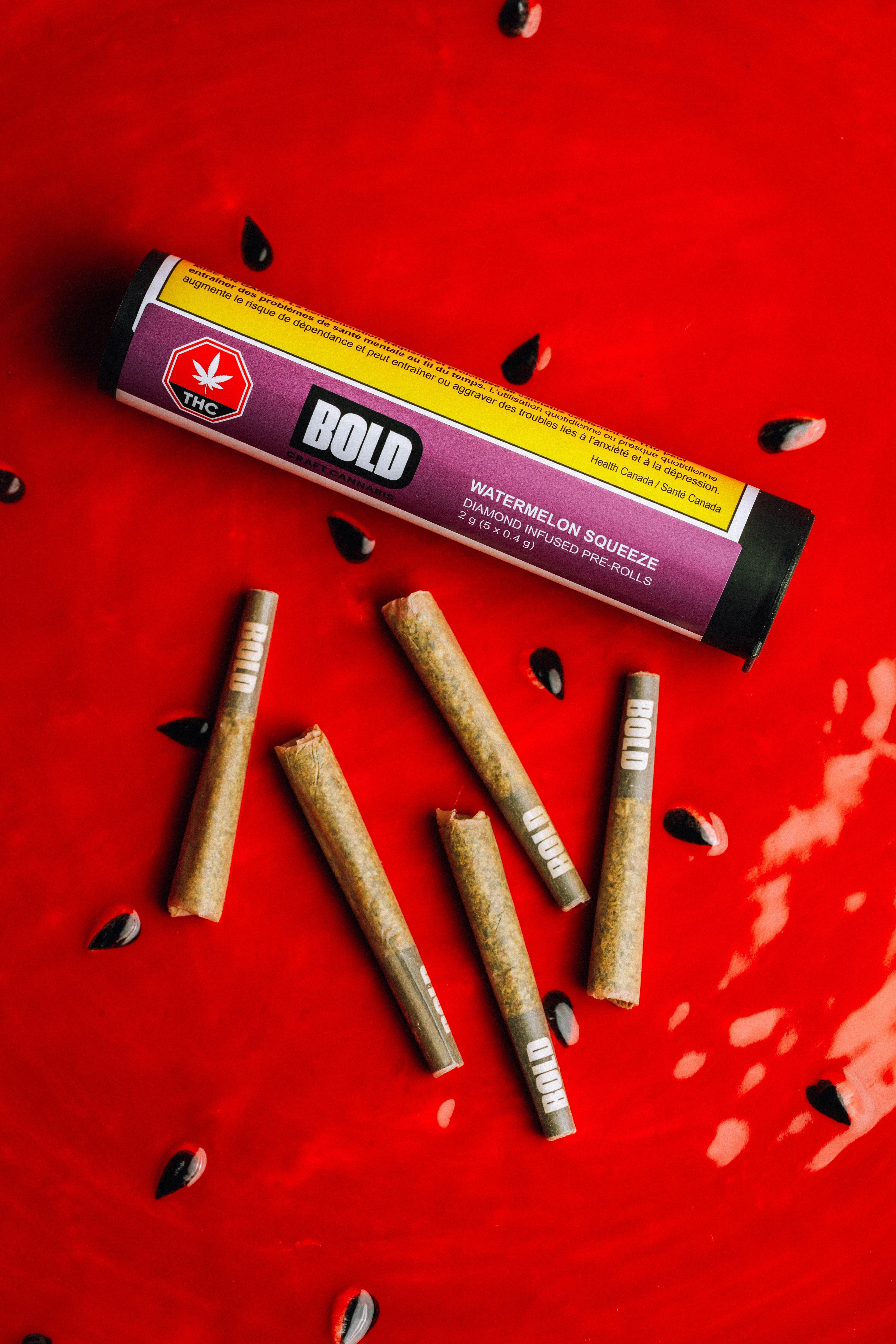 Whole craft flower infused with Diamonds and Watermelon Squeeze. These infused pre-rolls are high potency with juicy flavours of watermelon, the perfect blend of watermelon and sugar. The BOLD option for when regular pre-rolls aren’t enough.