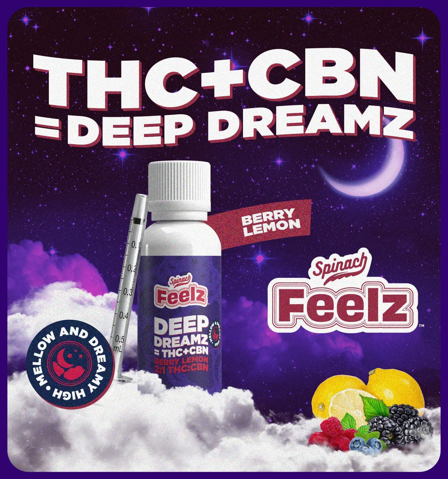 Relax and drift away with Spinach FEELZ™ Deep Dreamz THC+CBN Drops. These delicious drops with mixed berry and lemon flavour notes are ideal for a mellow and dreamy high, thanks to our special blend of THC and rare cannabinoid CBN. Kick back and float on by with Spinach FEELZ™ Deep Dreamz THC+CBN Drops. 30ml of oil that contains 600mg of THC and 300mg of CBN per bottle and can be dropped under the tongue. Feelz. The Way You Want.